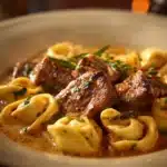 A hearty dish packed with flavor featuring seared steak and creamy tortellini in a garlic sauce, perfect for a cozy evening.