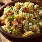A creamy pasta salad loaded with sharp cheddar, crispy bacon, and a tangy ranch dressing, perfect for summer picnics and potlucks.