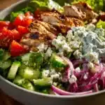 I make this bowl on busy weeknights. It feels fresh and honest. The flavors are bright. The prep is forgiving. You can swap grains, skip the feta, or use a store-bought tzatziki and still end up with something lovely. Sometimes I pair it with a fun side like BBQ chicken quesadillas for friends who want something cheesy on the side.