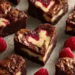 Fudgy heart-shaped brownies with a creamy cheesecake swirl and a bright raspberry flavor, perfect for sharing.