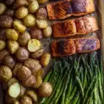 A one-pan dinner featuring roasted salmon, tender baby potatoes, and crisp asparagus, perfect for simple weeknight meals.