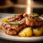 A comforting casserole featuring tender pork chops and creamy, cheesy potatoes, perfect for family dinners.