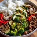 how to make Spicy Ground Beef Stir-Fry Bowl with Garlic Veggies & Steamy Rice